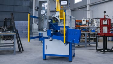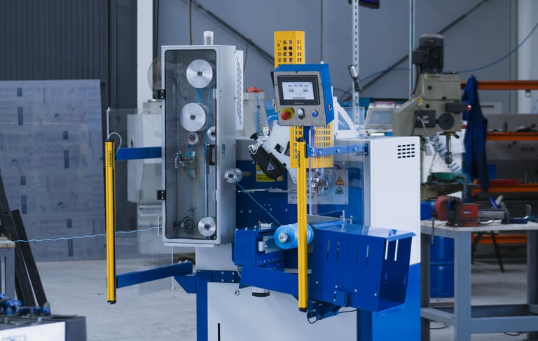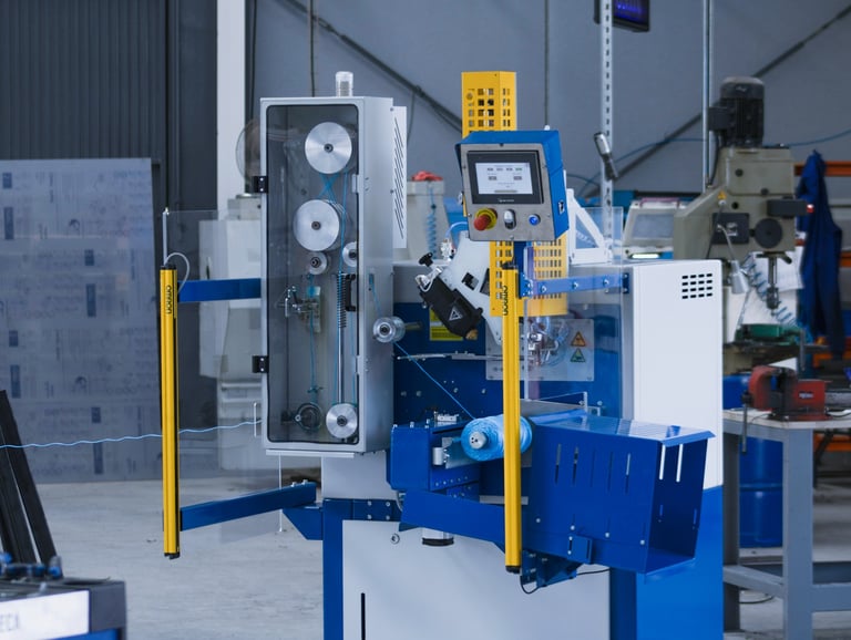 The machine incorporates an integral safety protection as optional which can be raised very easily for free access. In operation, the protection is lowered and there is a door in front of the bobbin in formation with upper hinges that make it rise automatically when the bobbin is automatically extracted. Security is complete.