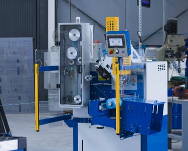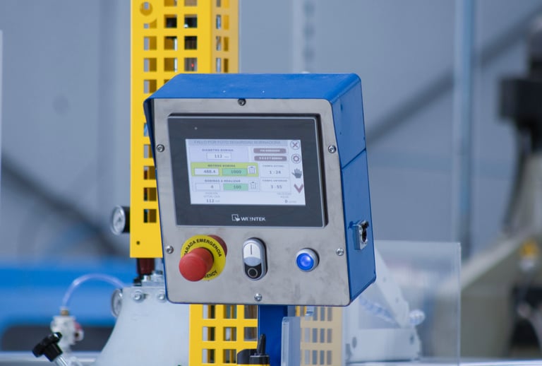 For adjusting all parameters and create recipes, protected by corresponding password. Recipes contain: 1/winding control (by diameter or by meters and the number of coils to be made), 2/ time control (like time of the bobbin in formation or remaining the total number of bobbins programmed); 3/ thread fixation control (number of bobbins automatically that can be made with glue or staples the machine is having); 4/ the winding settings menu (end of bobbin, number of crossings in the bobbin, which can be made for reducing bobbin winding time in subprograms , variation of the pitch or or yarn thickness separation, speeds and braking curves). ALL CONNECTABLE to ERP (SAP) and though Internet to the manufacturer for technical assistance and program updates).