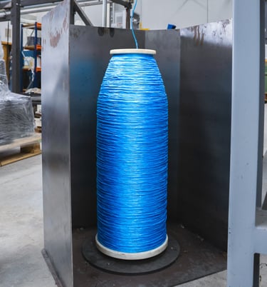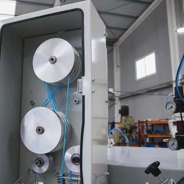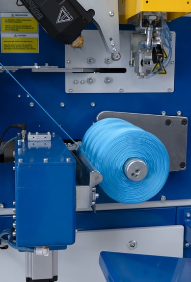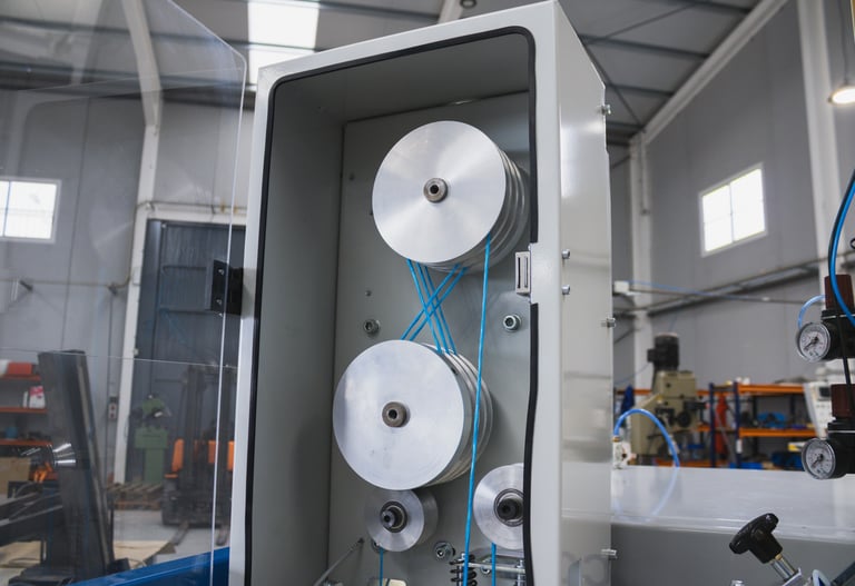 These rollers are where the thread is slowed down through its regulation in the PLC. Before it there is a mechanism to accept or not accept the knots in the final bobbin. The system optionally comes in a box with a door and vacuum cleaner for those Raffia or natural fibbers that creates excessive dust.
